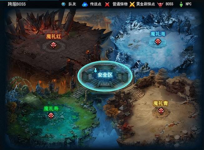 2. 分别有魔礼青、魔礼红、魔礼海、魔礼寿四个BOSS分布在地图四角,玩家可随意选择BOSS前往击杀。