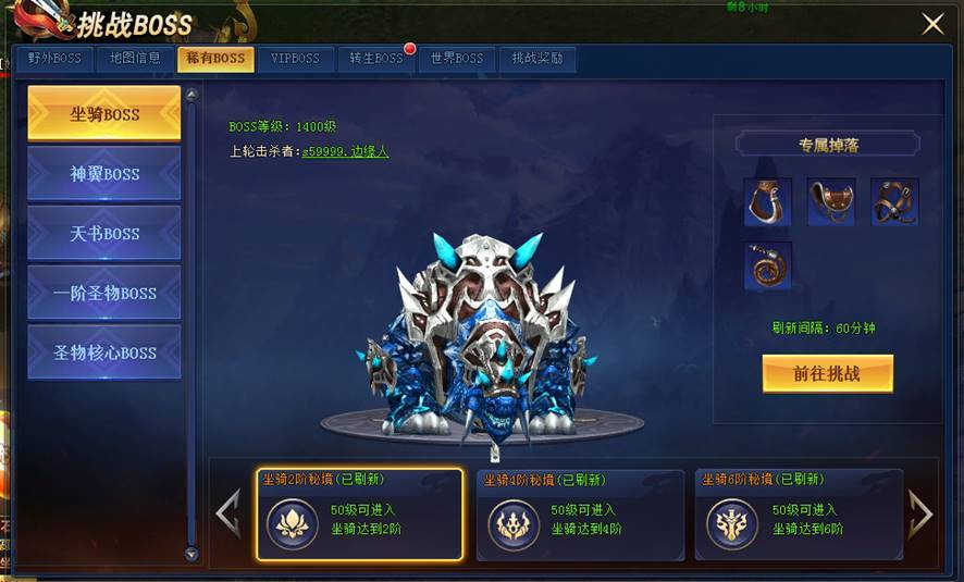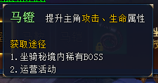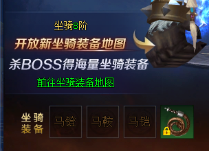 当坐骑达到2阶后,可前往坐骑2阶秘境,挑战坐骑BOSS获取坐骑装备
