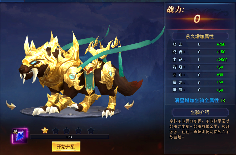 每进阶1次,坐骑成长值+1,坐骑值充满后,坐骑星级+1,获得一定的属性加成