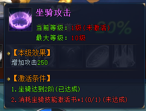 当玩家坐骑升到一定的阶数时,可以消耗“坐骑技能激活书”来学习坐骑技能: