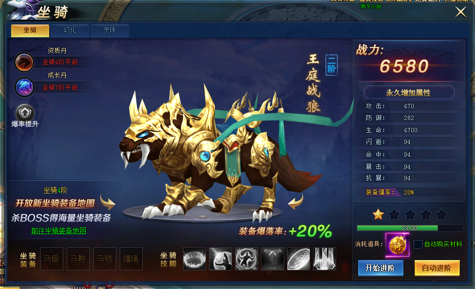 点击【开始进阶】按钮,可消耗“坐骑升阶丹”进行坐骑升阶