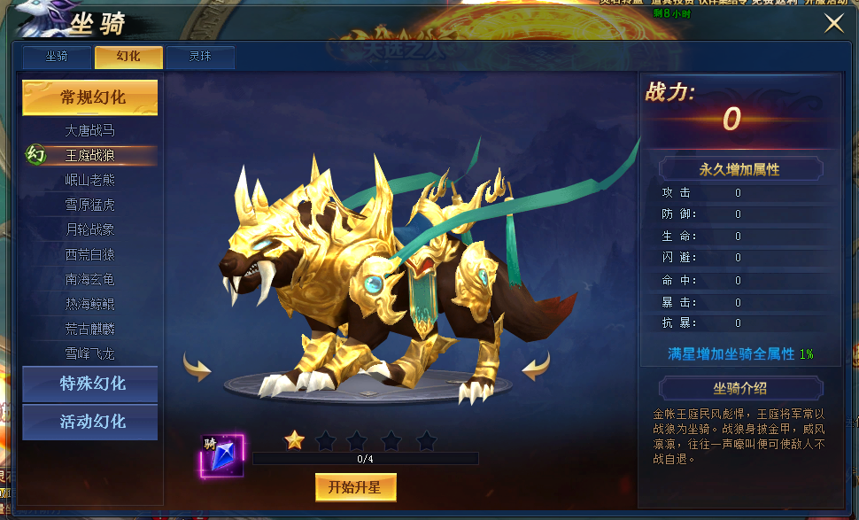 升星可增加坐骑属性,幻化满星后,增加坐骑全属性2%
