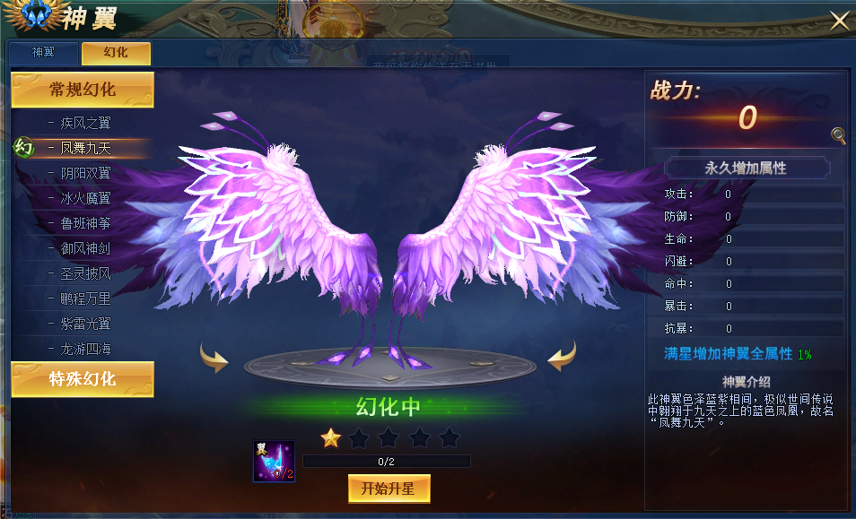 升星可增加神翼属性,幻化满星后,增加神翼全属性2%