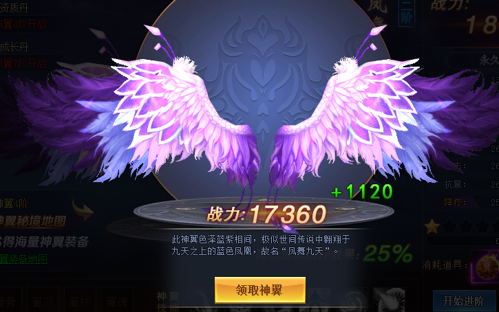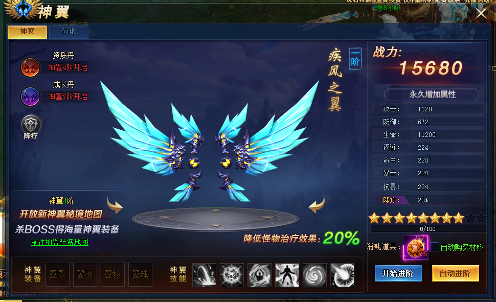 点击【开始进阶】按钮,可消耗“神翼升阶丹”进行神翼升阶