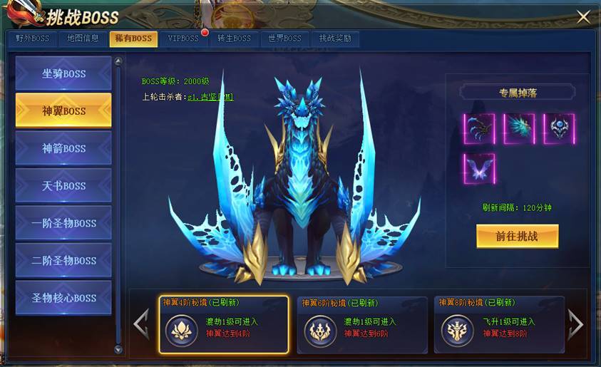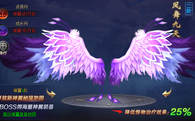 第二大陆野外BOSS都拥有强力回血技能,神翼升阶可提升神翼降疗效果,用于克制BOSS回血