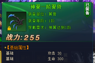 每进阶1次,神翼成长值+1,神翼值充满后,神翼星级+1,获得一定的属性加成