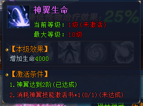 当玩家神翼升到一定的阶数时,可以消耗“神翼技能激活书”来学习神翼技能: