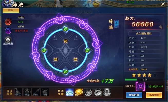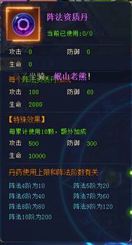 阵法升至4阶时,玩家可在背包中使用“阵法资质丹”,增加固定的阵法属性