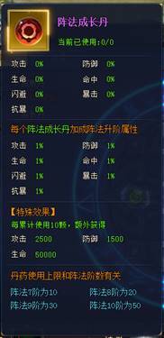 阵法升至7阶时,玩家可在背包中使用“阵法成长丹”,增加百分比的阵法属性