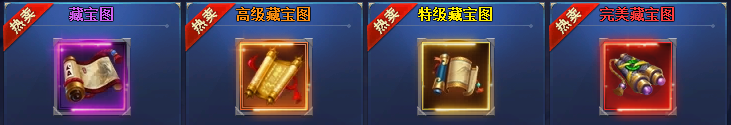 根据可使用等级及珍惜度,藏宝图分为:藏宝图、高级藏宝图、特级藏宝图、完美藏宝图