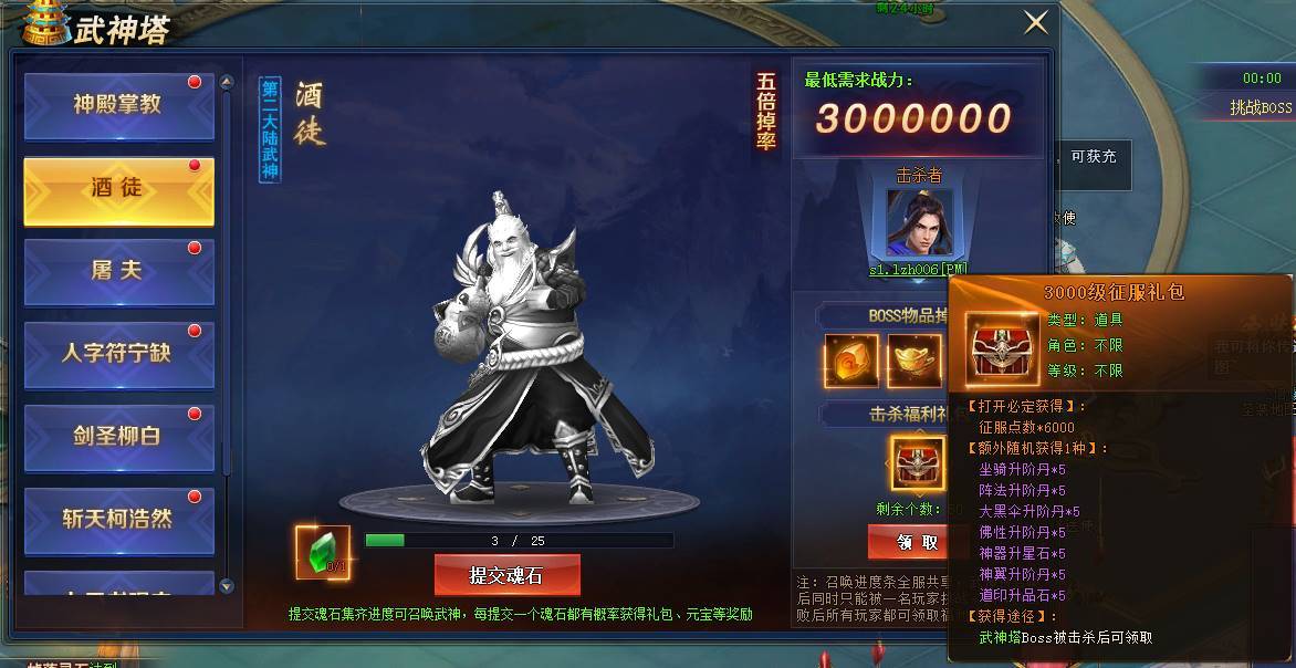 BOSS要求战力较高,击杀可获道印升品材料和多件装备,并且为全服玩家发放50个福利礼包。