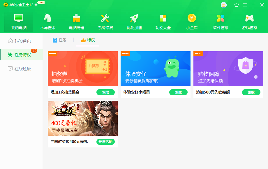 1、领取特权礼包需要360安全卫士等级达到指定等级!如未达到指定等级,可通过完成下方任务提升等级。